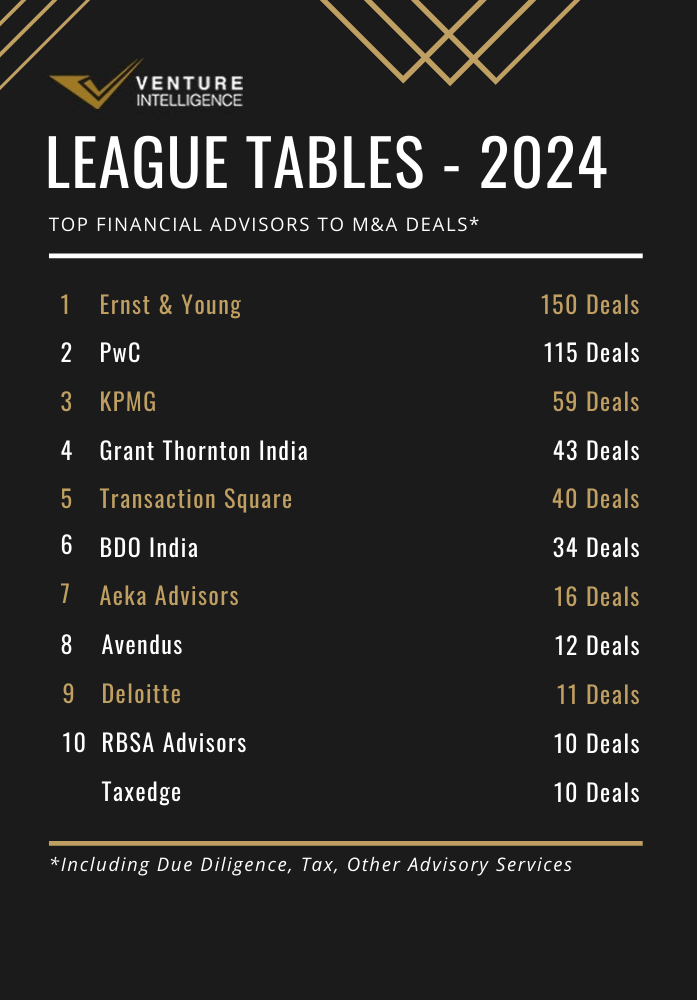 The Venture Intelligence League Tables, the first such initiative exclusively tracking transactions involving India-based companies, are based on the value of PE and M&A transactions advised by Financial and Legal Advisory firms.